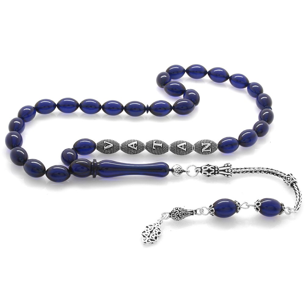 / 925 Ayar Gümüş Püsküllü Arpa Kesim Gümüş İsim Yazılı Lacivert Sıkma Kehribar Tesbih