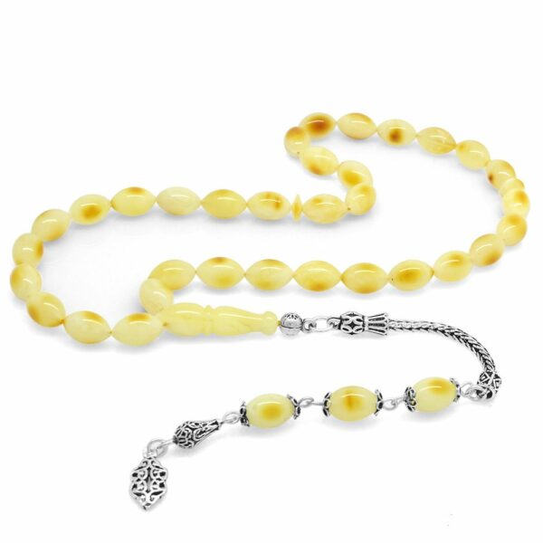 925 Ayar Gümüş Püsküllü Arpa Kesim Sarı-Beyaz Hareli Kınalı Damla Kehribar Tesbih
