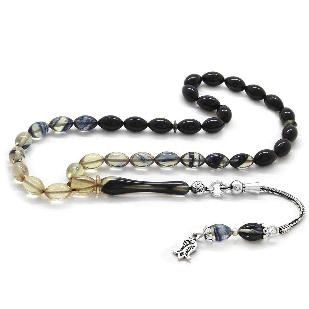 925 Ayar Gümüş Püsküllü Bilek Boy Süzme Siyah-Beyaz Ateş Kehribar Tesbih