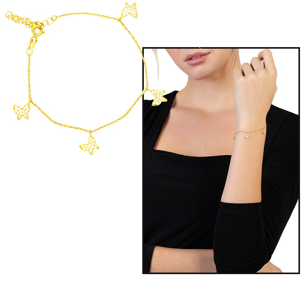 / Beyaz Zirkon Taşlı Gold Renk Kelebek Tasarım 925 Ayar Gümüş Kadın Bileklik